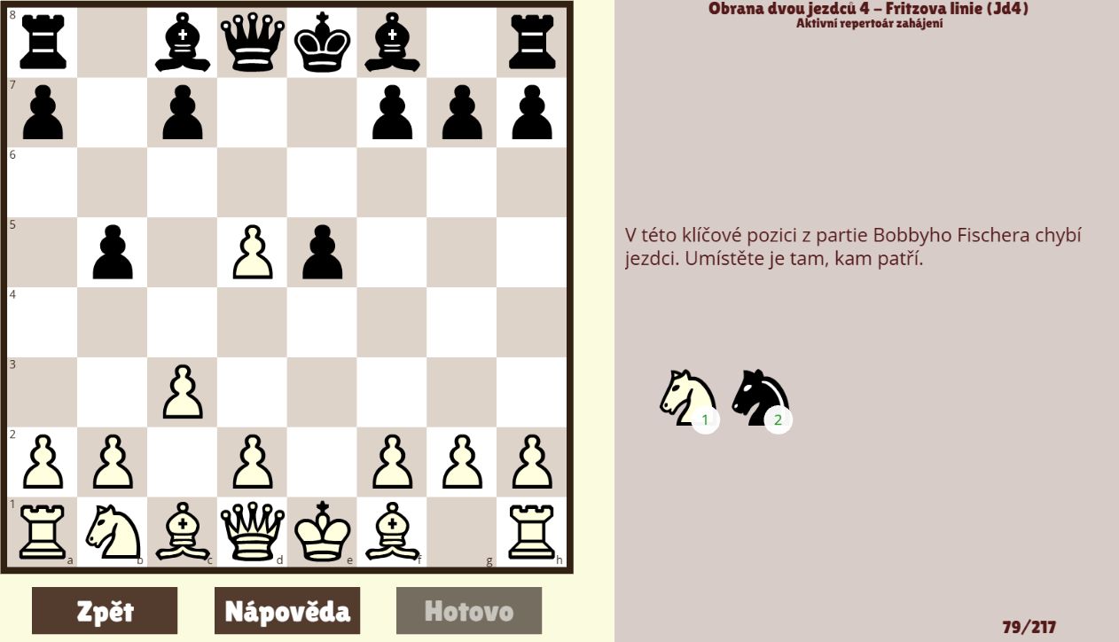Krátká partie: Uživatel si může projít krátkou partii s typickými tahy z daného zahájení. Jde se hezky tah po tahu s četným komentářem a nápovědou. Odhalujeme pasti v zahájení a představujeme typické plány a cíle při přechodu do střední hry.
