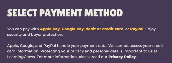 Traditional payment methods remain available for users who prefer them. Purchases may still be completed using standard debit or credit cards or through established PayPal accounts. Regardless of the selected payment method, LearningChess.net is committed to providing a flexible, secure, and user-friendly environment that upholds excellence in both chess education and data privacy.